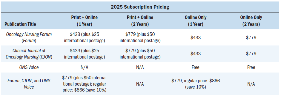 ONS offers several subscription options to the award-winning ONS Voice, Clinical Journal of Oncology Nursing, and Oncology Nursing Forum.